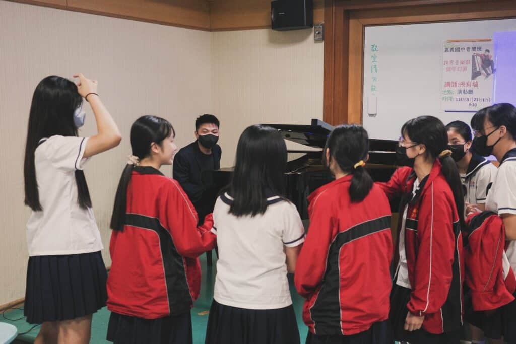 講座中,學生們展現出高度的好奇心與學習熱情。即便是課間休息,仍圍在鋼琴旁,積極詢問張育瑞各種音樂問題:「老師,你有聽過這首曲子嗎?」、「你能即興演奏這段旋律嗎?」學生們的熱情互動讓講座氣氛活潑而充滿能量,也讓張育瑞回想起自己國中時下課總是聚集在鋼琴前,應同學的要求即興演奏,正是在那段時光,他的即興能力得到了最大的提升。